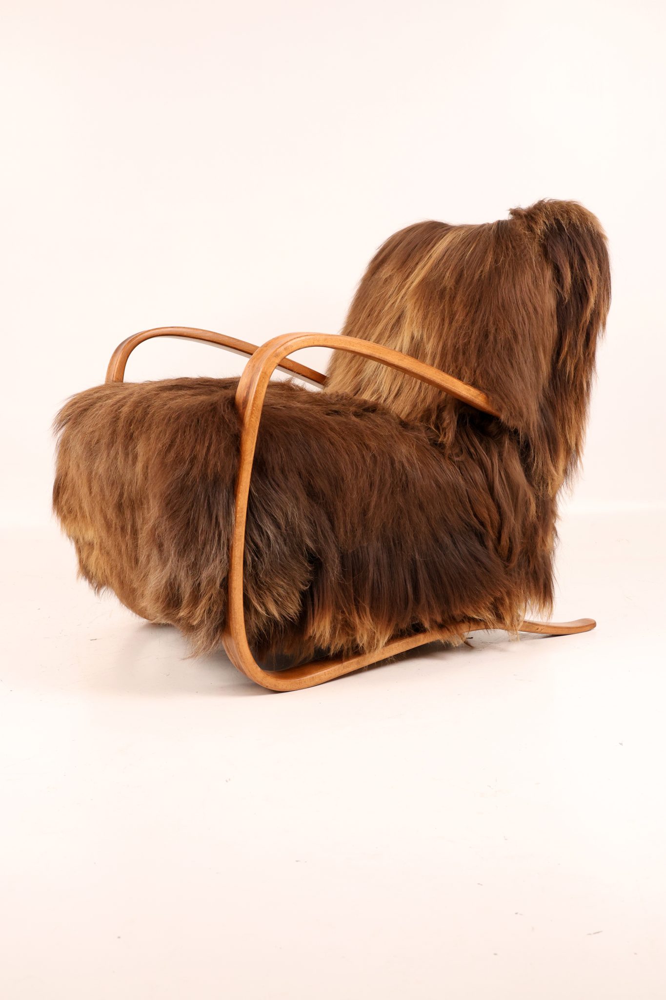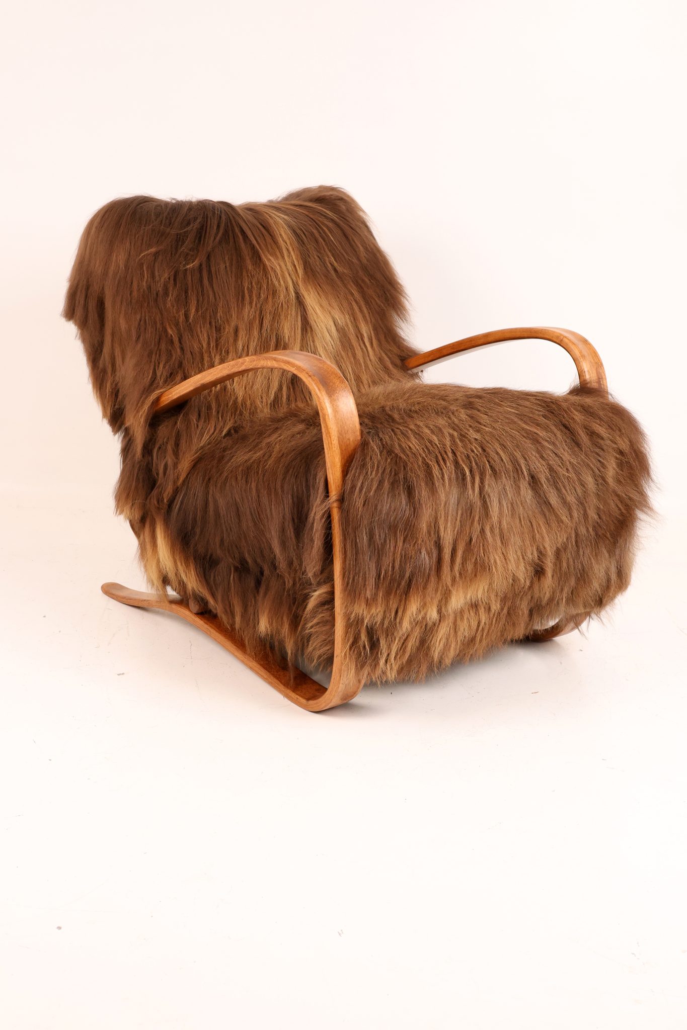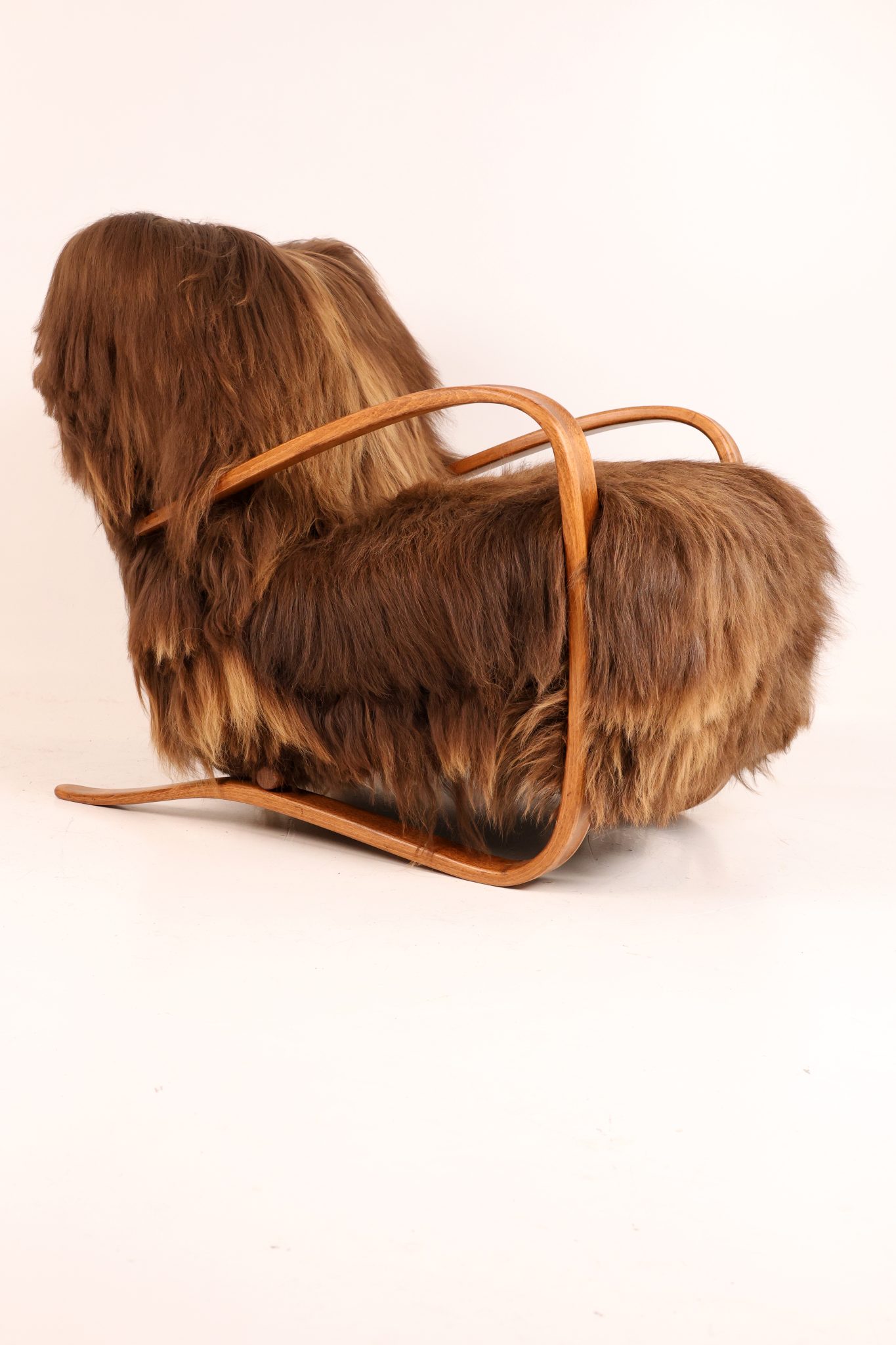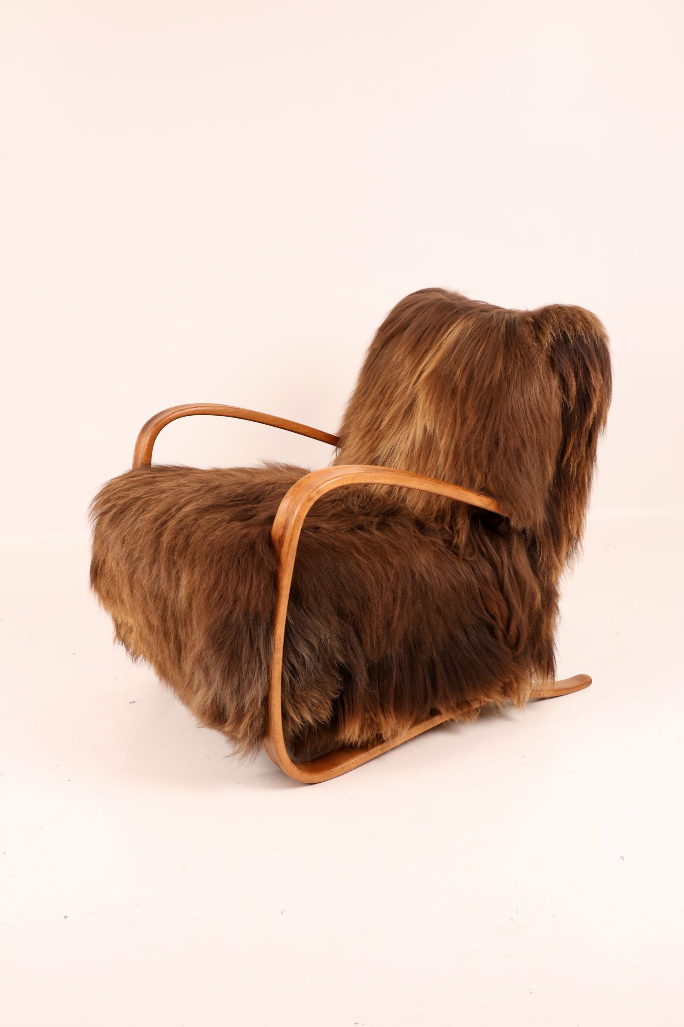 Rzadki egzemplarz kultowego fotela Model H-269 zaprojektowanego przez Jindřicha Halabalę, wykonany w Czechosłowacji w latach 30. XX wieku. Mebel został profesjonalnie odrestaurowany – jego elegancka, gięta bukowa konstrukcja została odnowiona w sposób podkreślający naturalne usłojenie drewna. Siedzisko obito luksusową islandzką wełną owczą, której włókna osiągają długość do 15 cm i cenione są za swoją miękkość, wytrzymałość oraz wyjątkową fakturę. To ponadczasowy klasyk designu, łączący modernistyczną elegancję z doskonałym rzemiosłem — prawdziwy obiekt kolekcjonerski.
