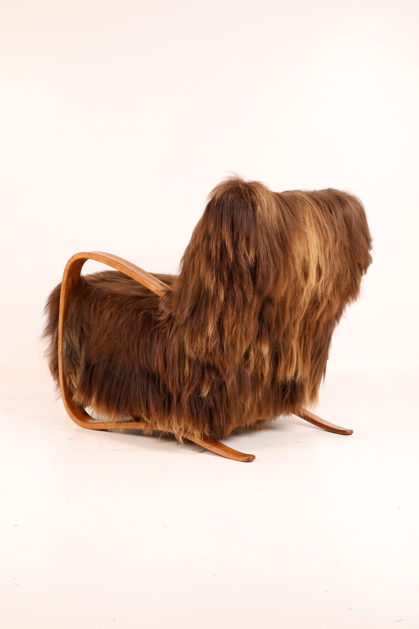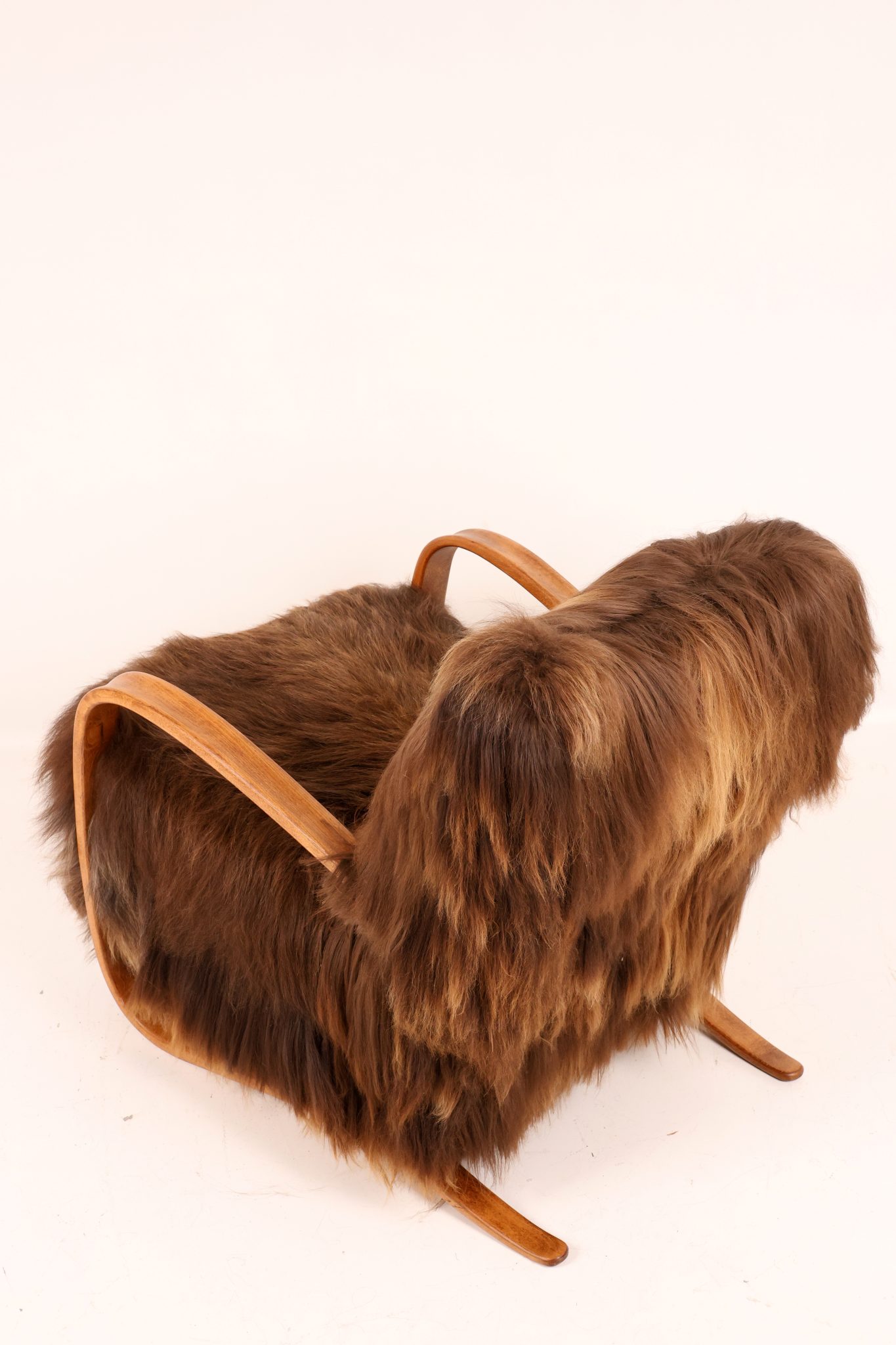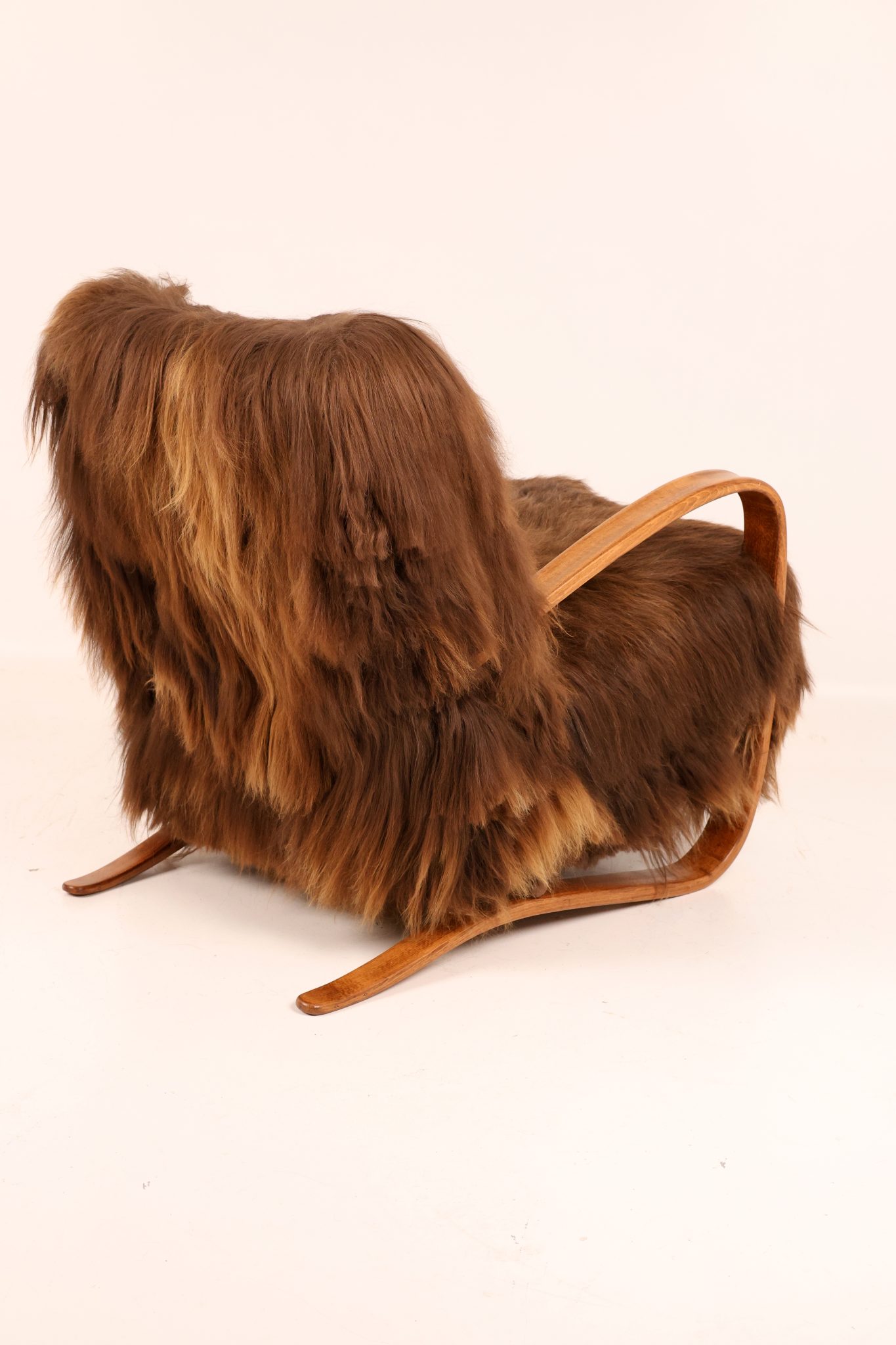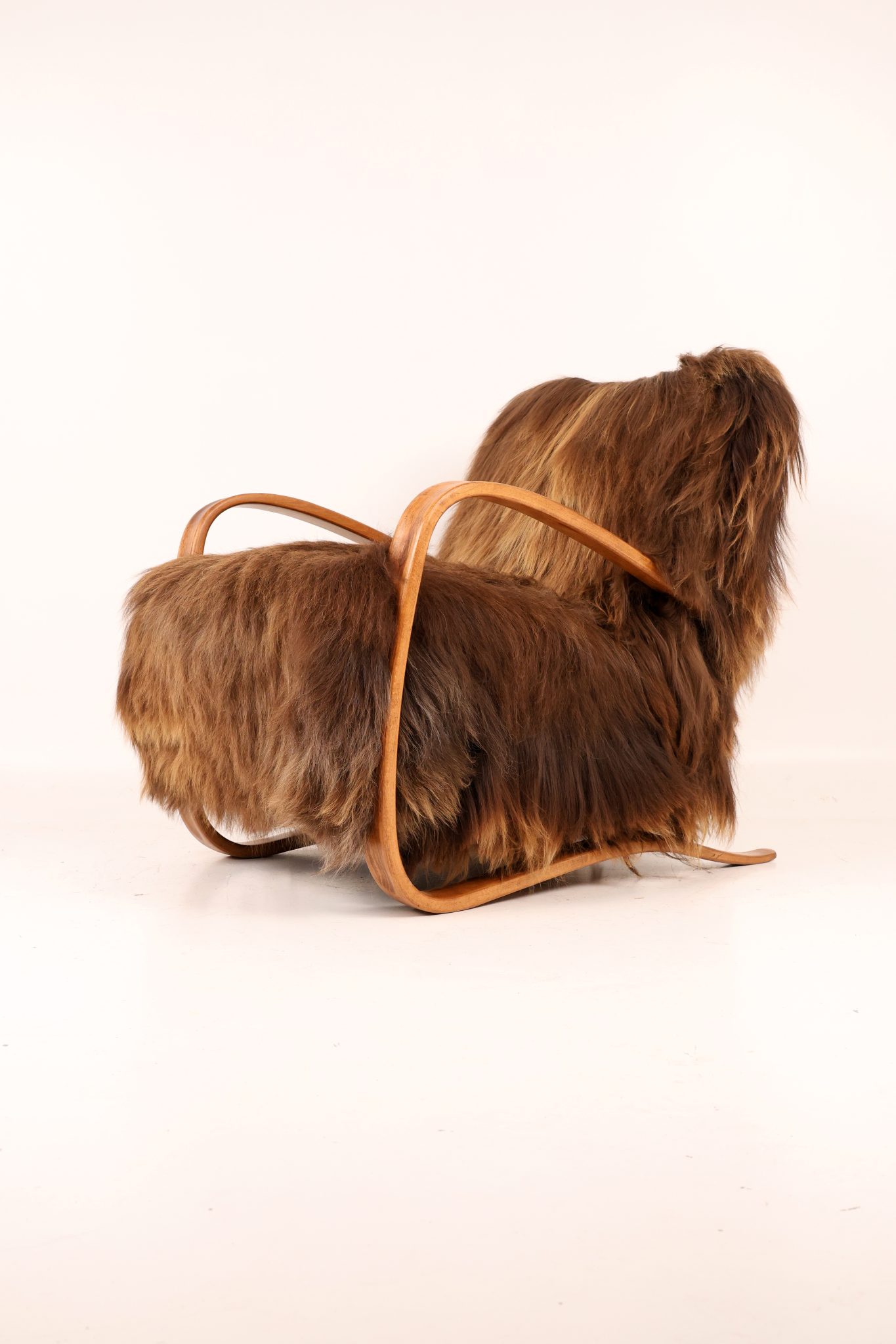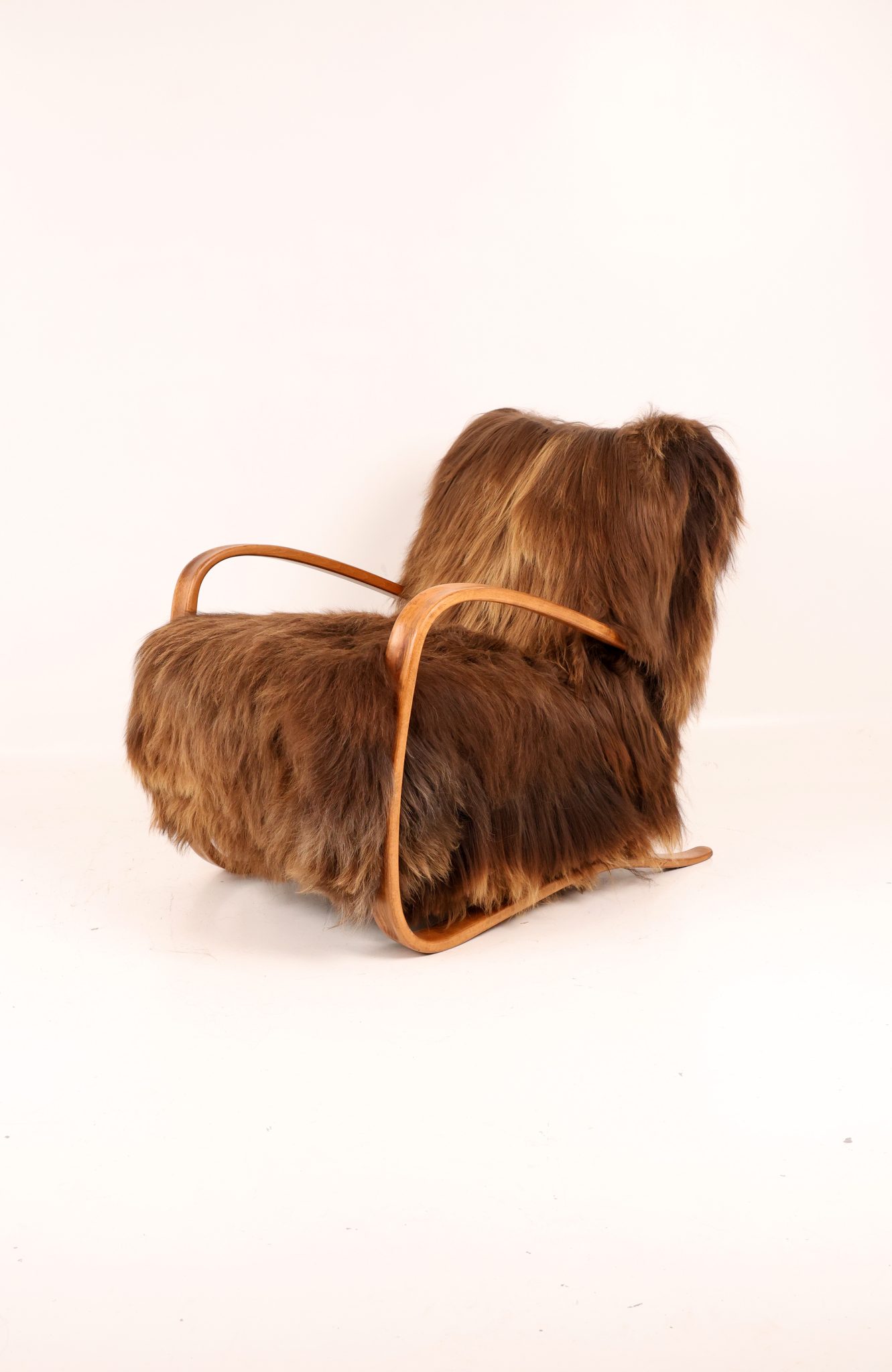 Rzadki egzemplarz kultowego fotela Model H-269 zaprojektowanego przez Jindřicha Halabalę, wykonany w Czechosłowacji w latach 30. XX wieku. Mebel został profesjonalnie odrestaurowany – jego elegancka, gięta bukowa konstrukcja została odnowiona w sposób podkreślający naturalne usłojenie drewna. Siedzisko obito luksusową islandzką wełną owczą, której włókna osiągają długość do 15 cm i cenione są za swoją miękkość, wytrzymałość oraz wyjątkową fakturę. To ponadczasowy klasyk designu, łączący modernistyczną elegancję z doskonałym rzemiosłem — prawdziwy obiekt kolekcjonerski.