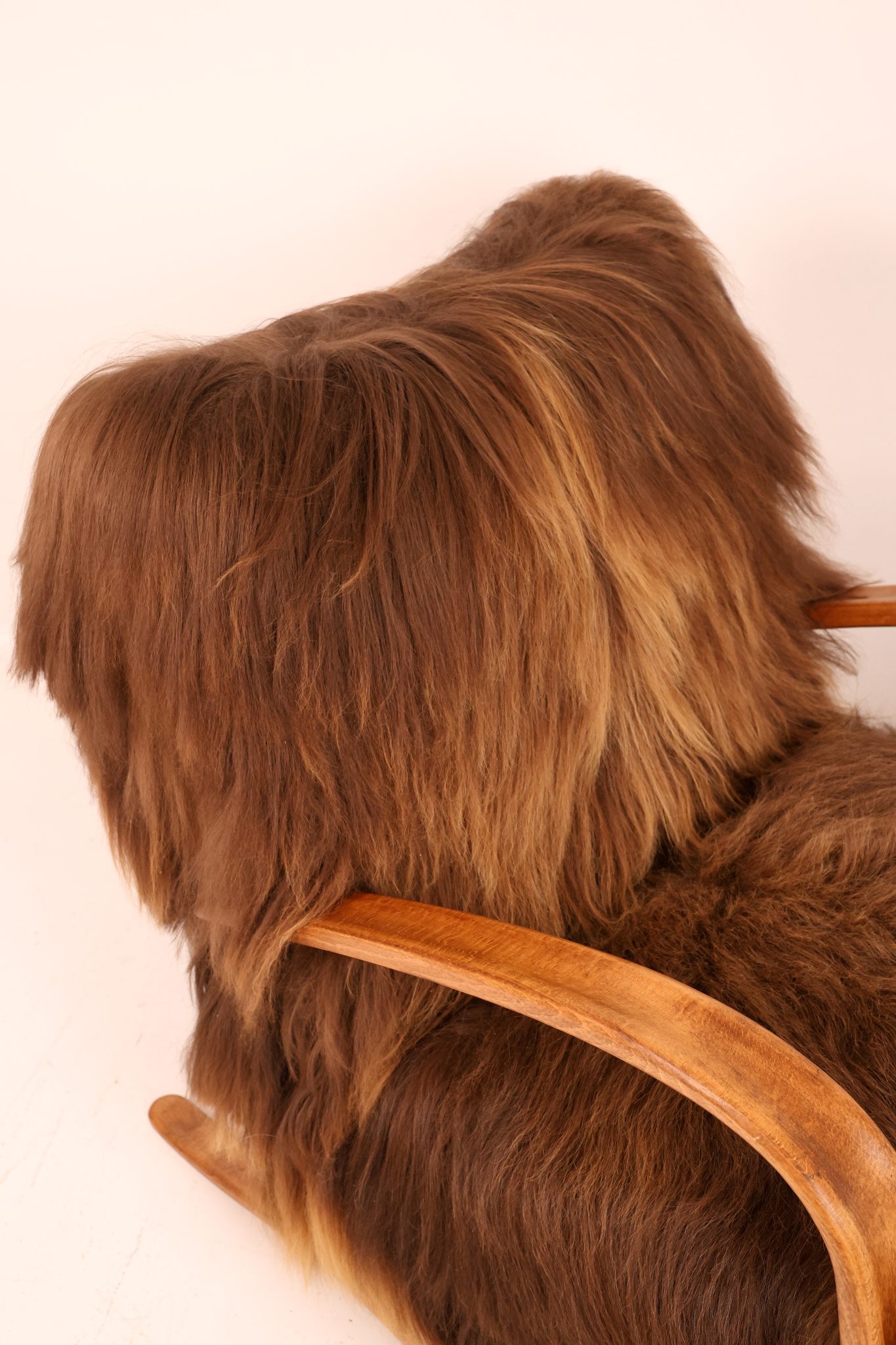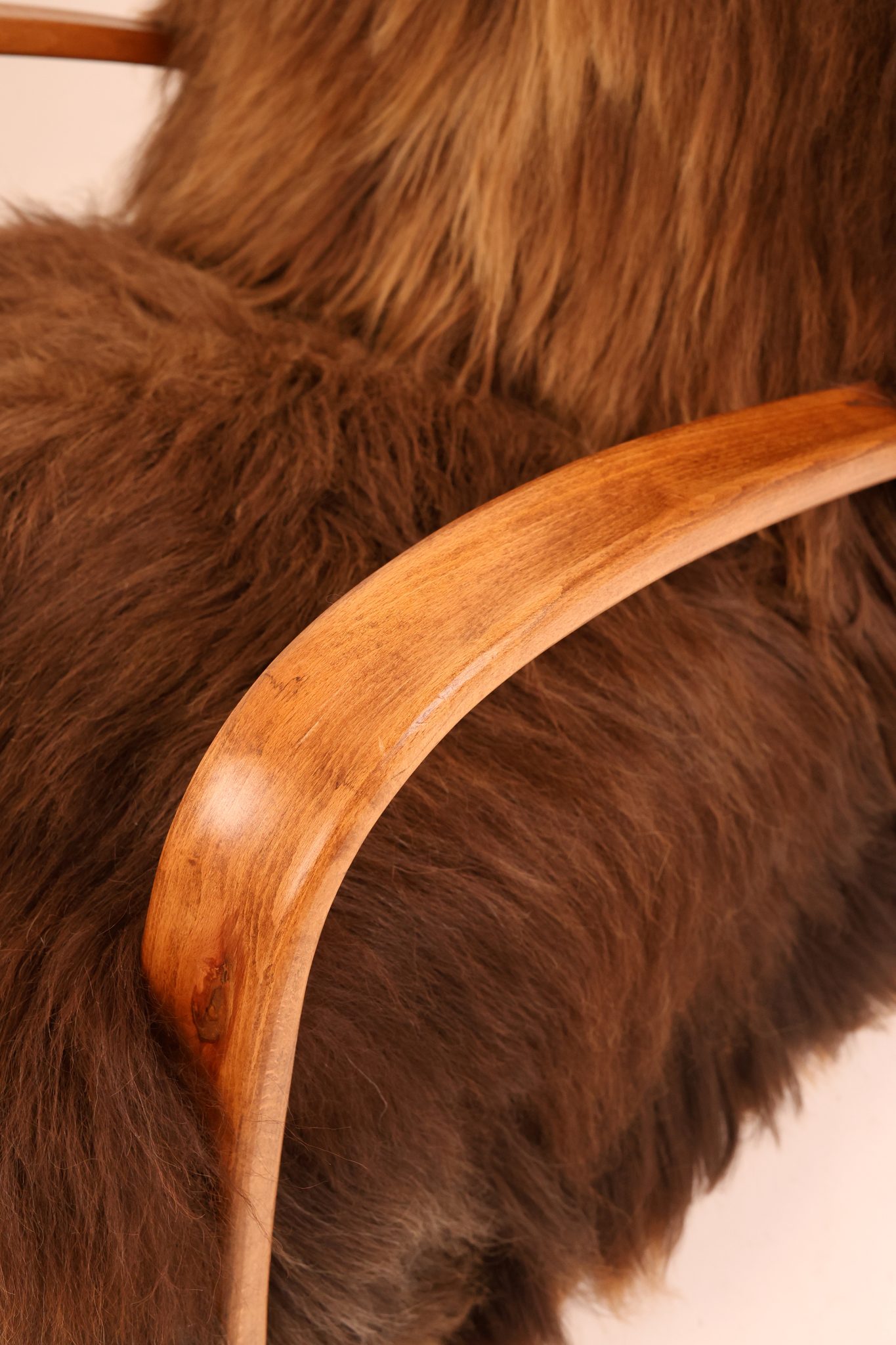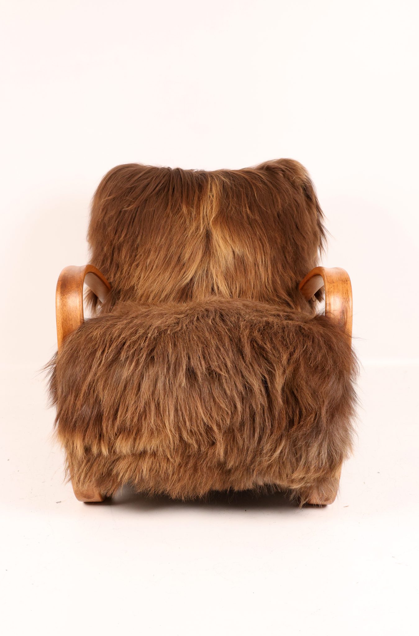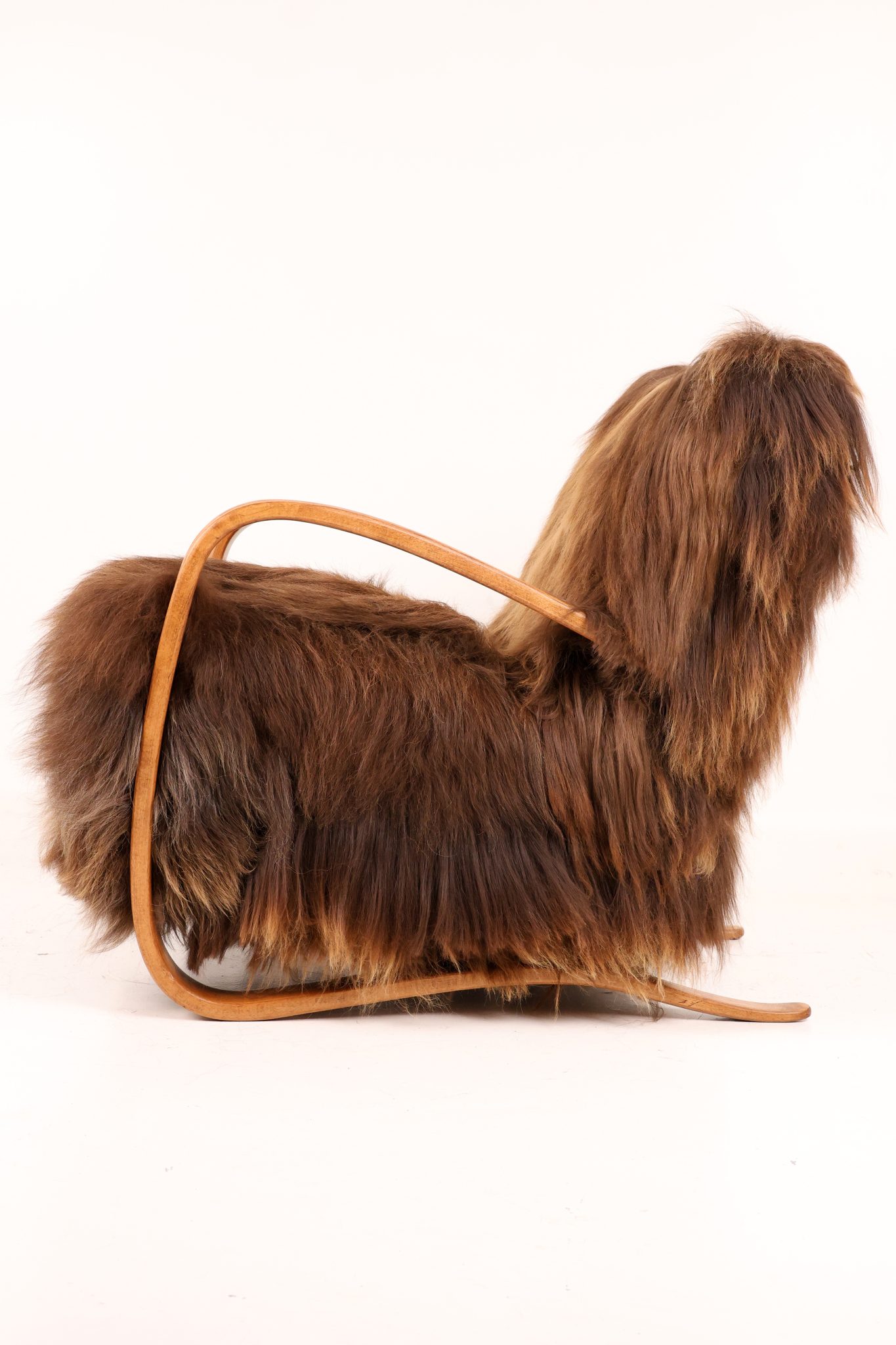 Rzadki egzemplarz kultowego fotela Model H-269 zaprojektowanego przez Jindřicha Halabalę, wykonany w Czechosłowacji w latach 30. XX wieku. Mebel został profesjonalnie odrestaurowany – jego elegancka, gięta bukowa konstrukcja została odnowiona w sposób podkreślający naturalne usłojenie drewna. Siedzisko obito luksusową islandzką wełną owczą, której włókna osiągają długość do 15 cm i cenione są za swoją miękkość, wytrzymałość oraz wyjątkową fakturę. To ponadczasowy klasyk designu, łączący modernistyczną elegancję z doskonałym rzemiosłem — prawdziwy obiekt kolekcjonerski.