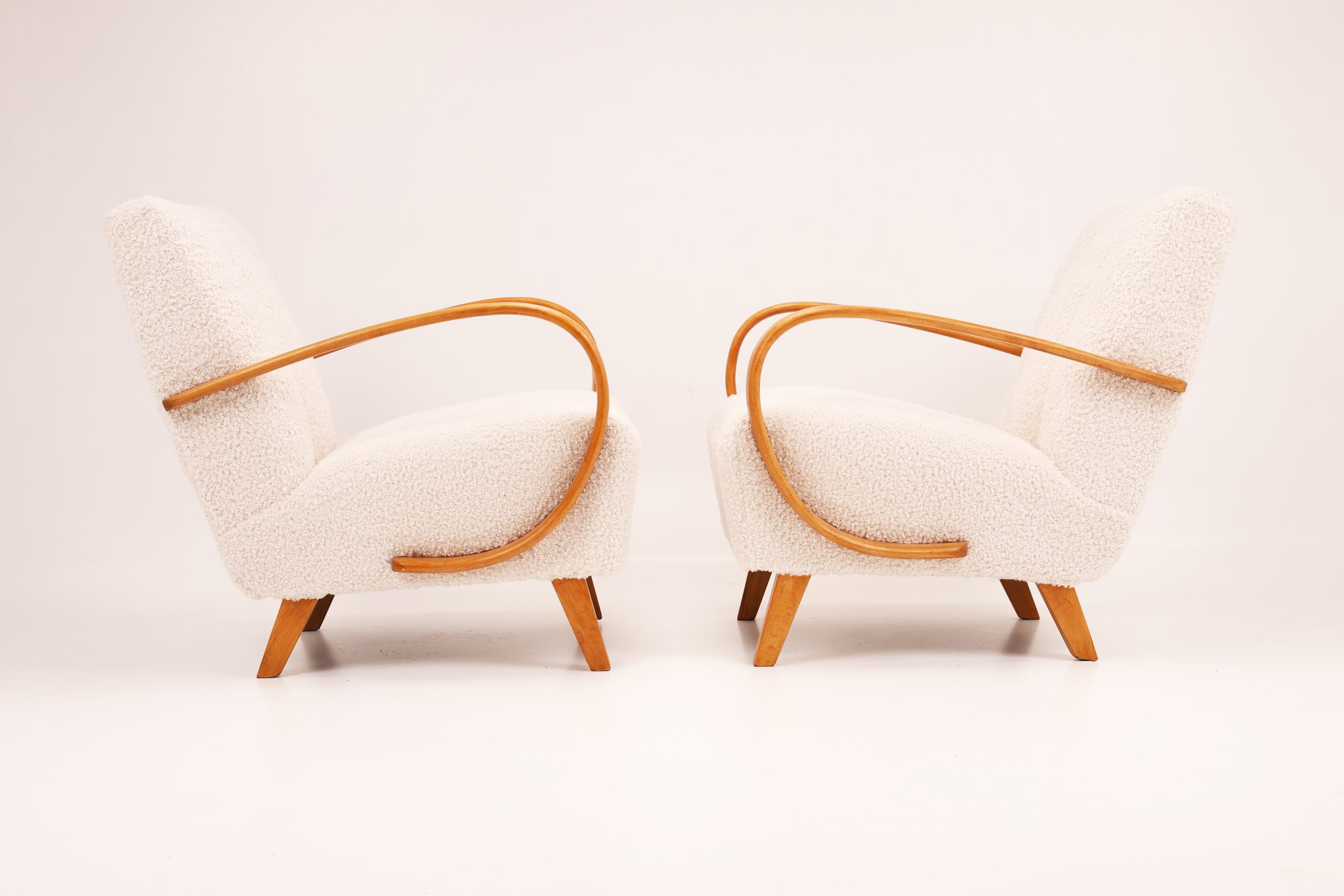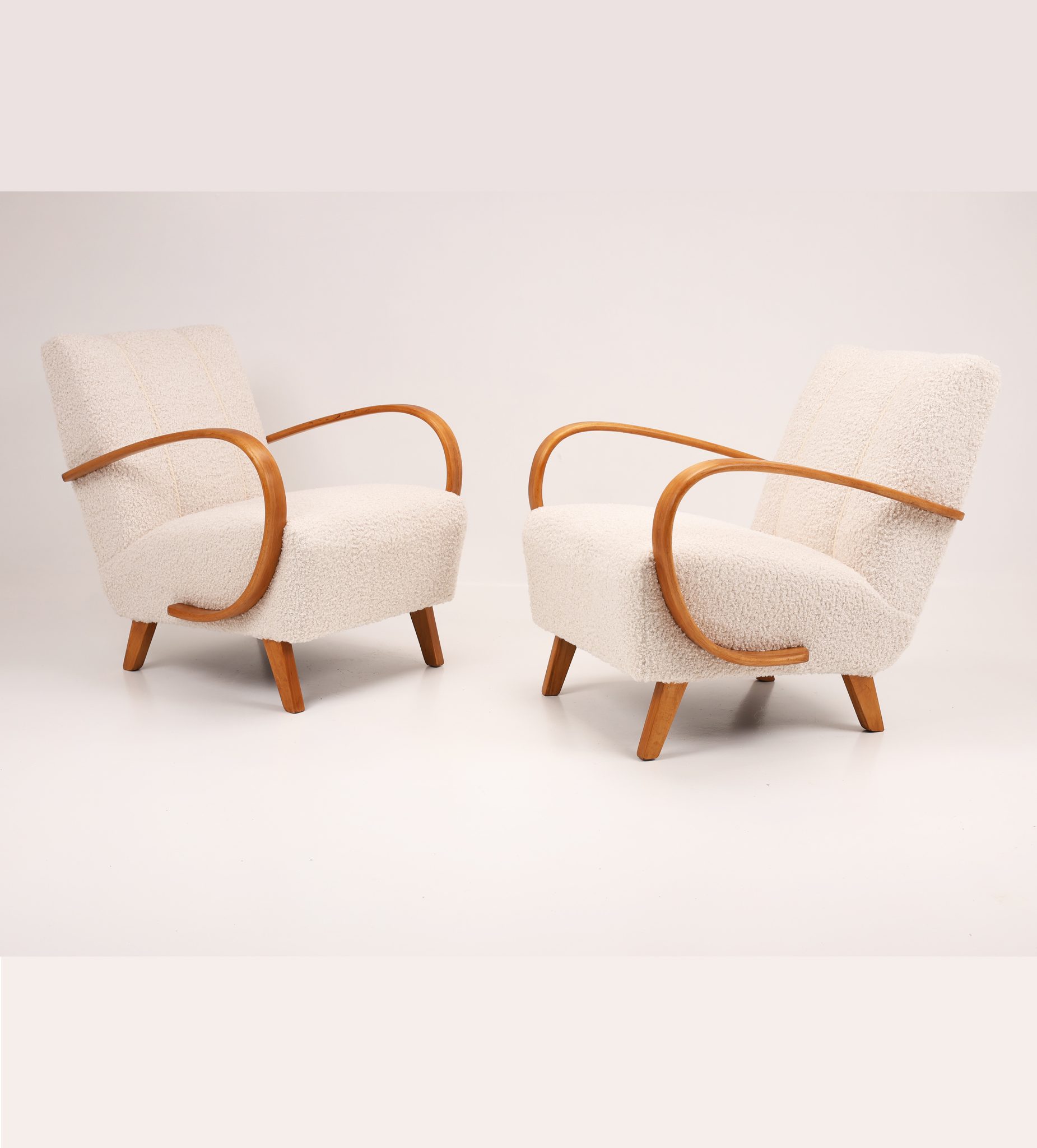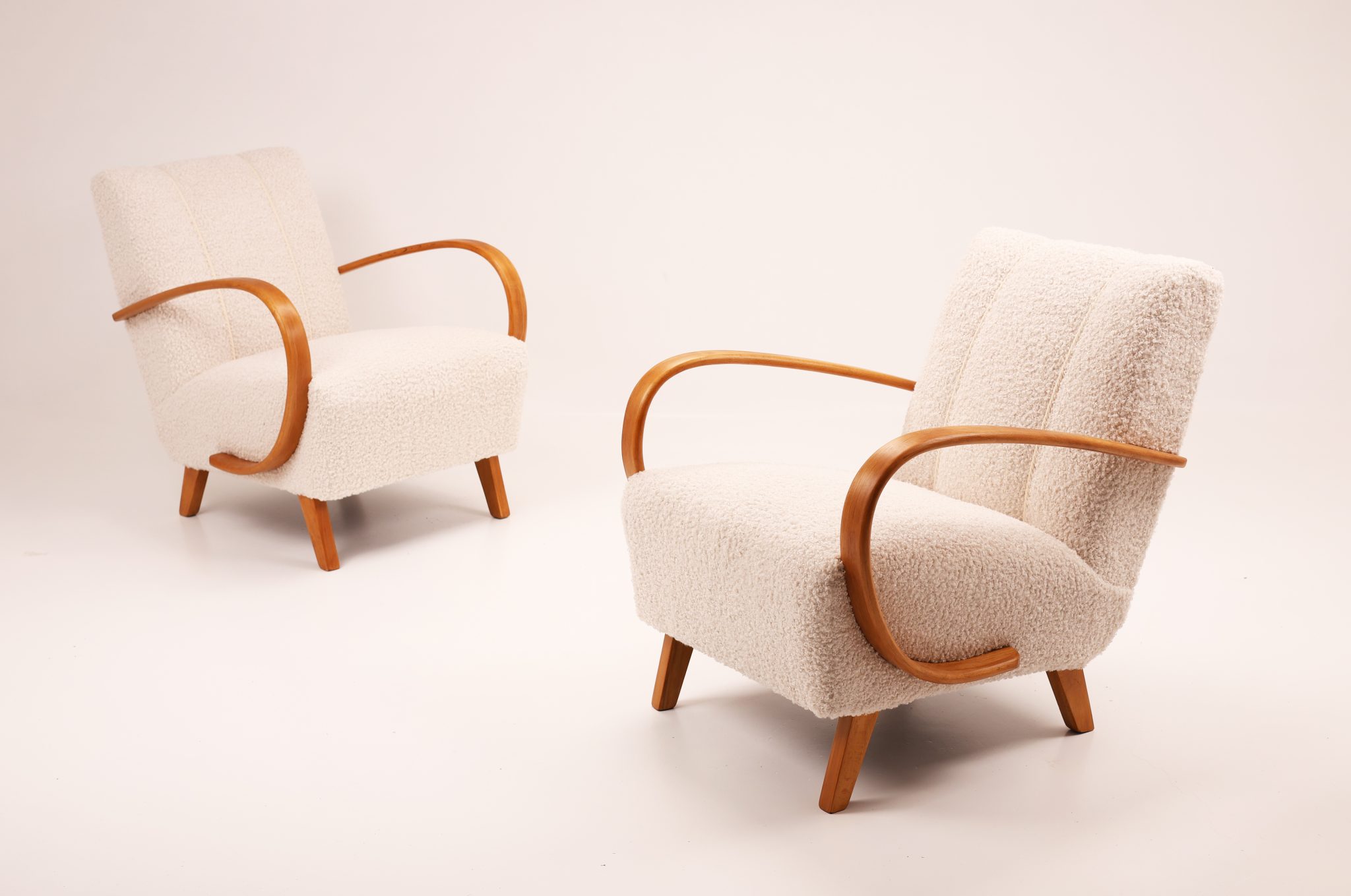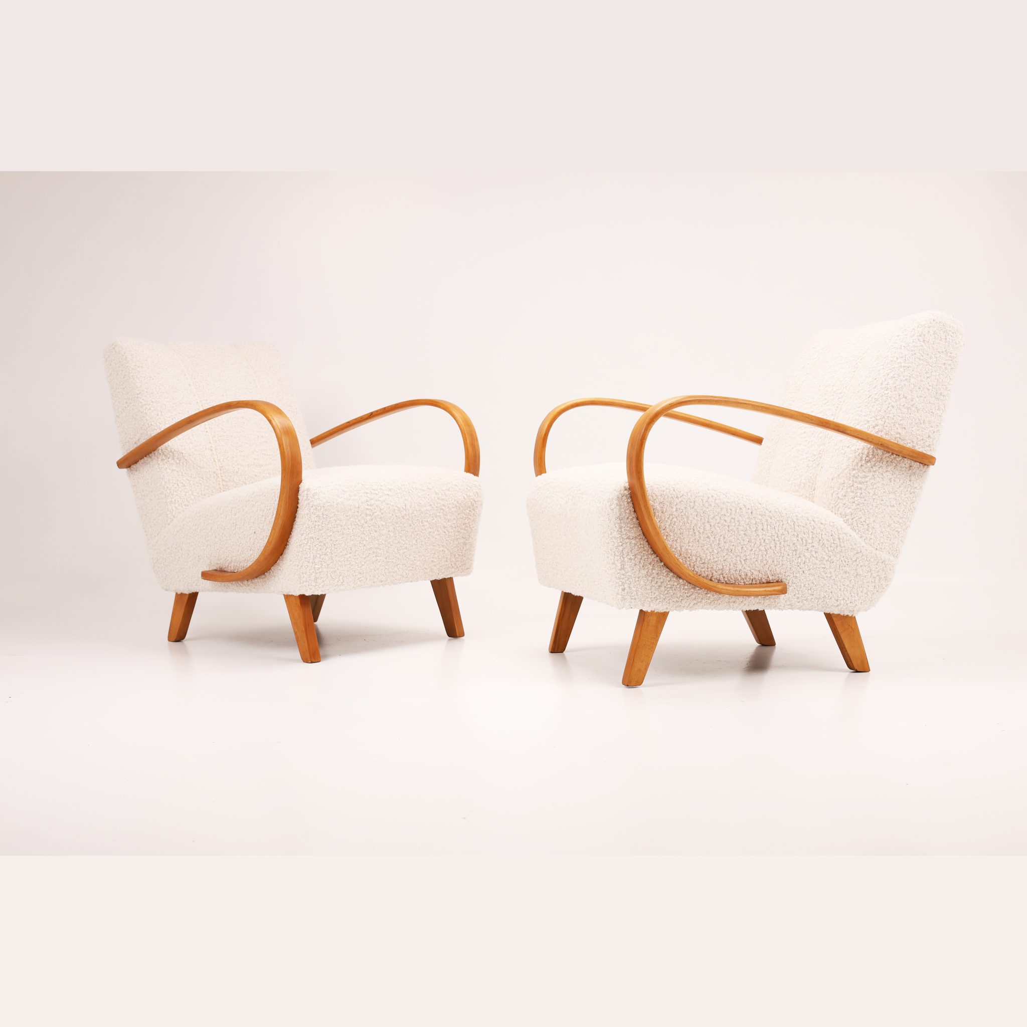 Zachwycająca para kultowych foteli Model H-410 zaprojektowanych przez Jindřicha Halabalę, jedną z czołowych postaci czeskiego modernizmu. Te rzeźbiarskie formy wyróżniają się charakterystycznymi, giętymi podłokietnikami z drewna bukowego oraz eleganckimi proporcjami, które doskonale oddają ponadczasową estetykę modernizmu.