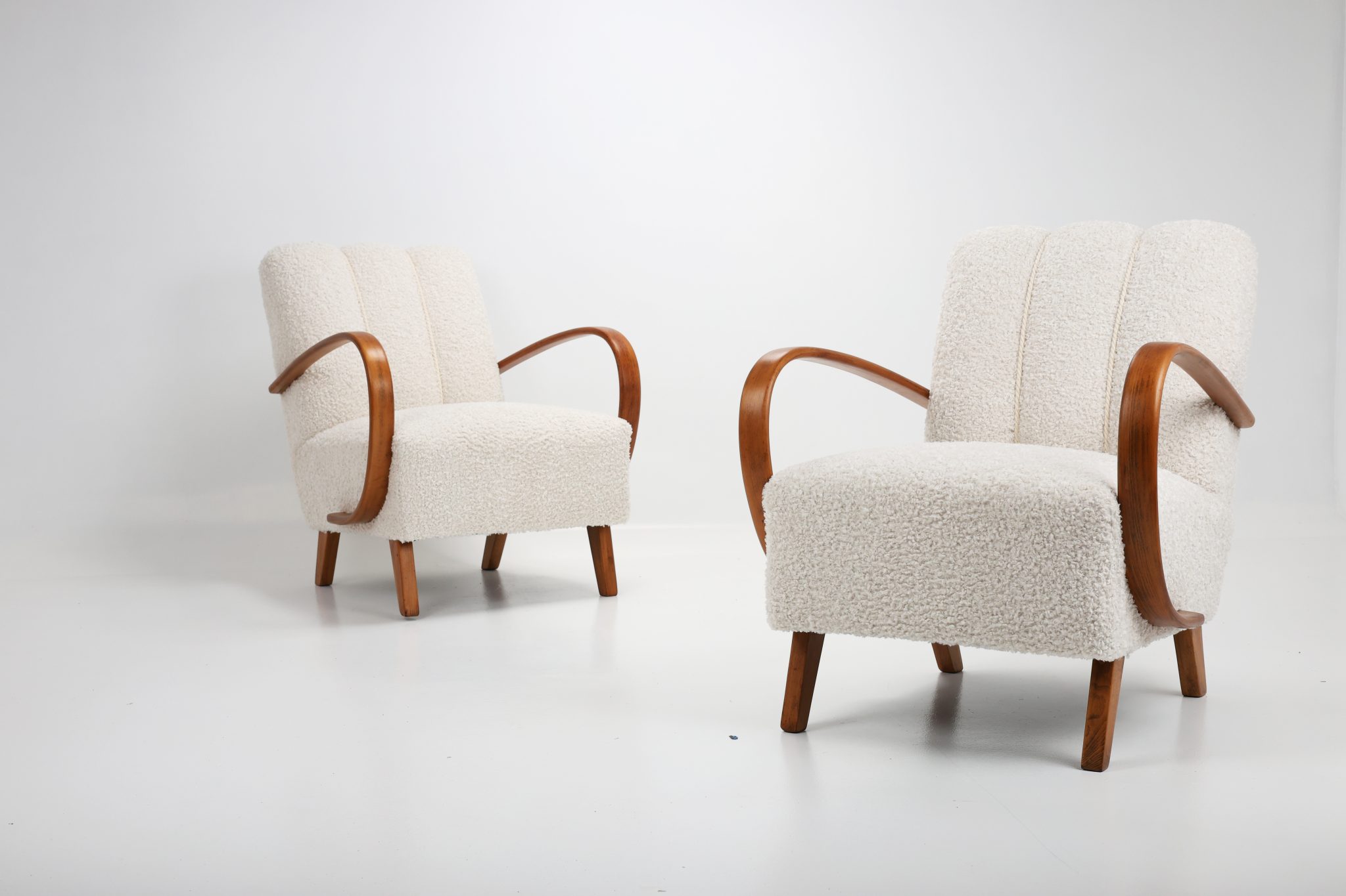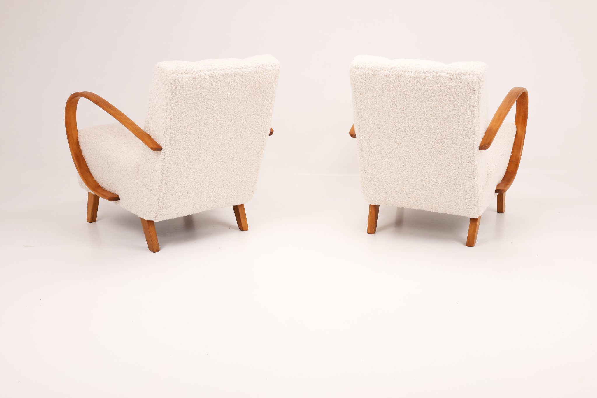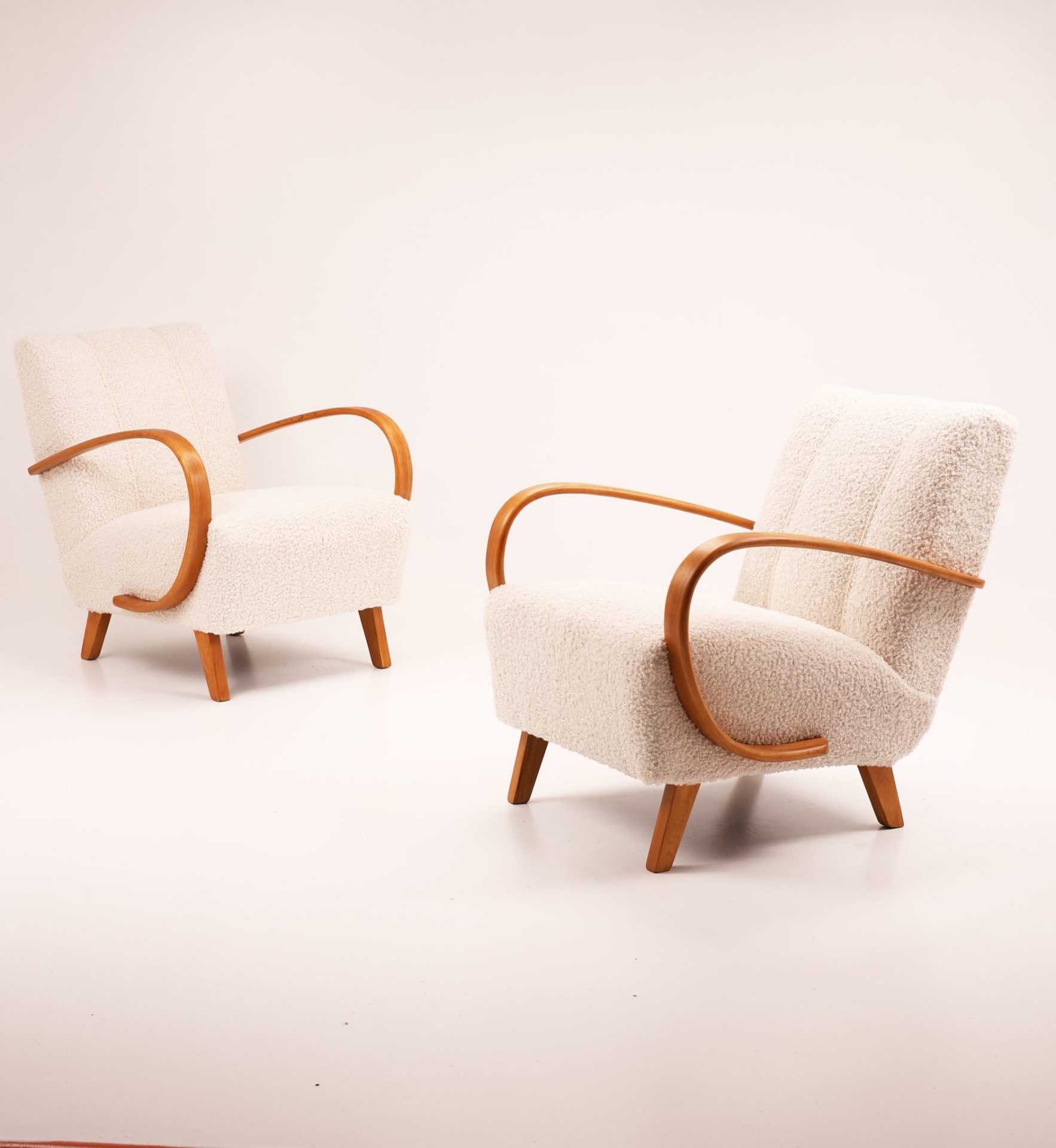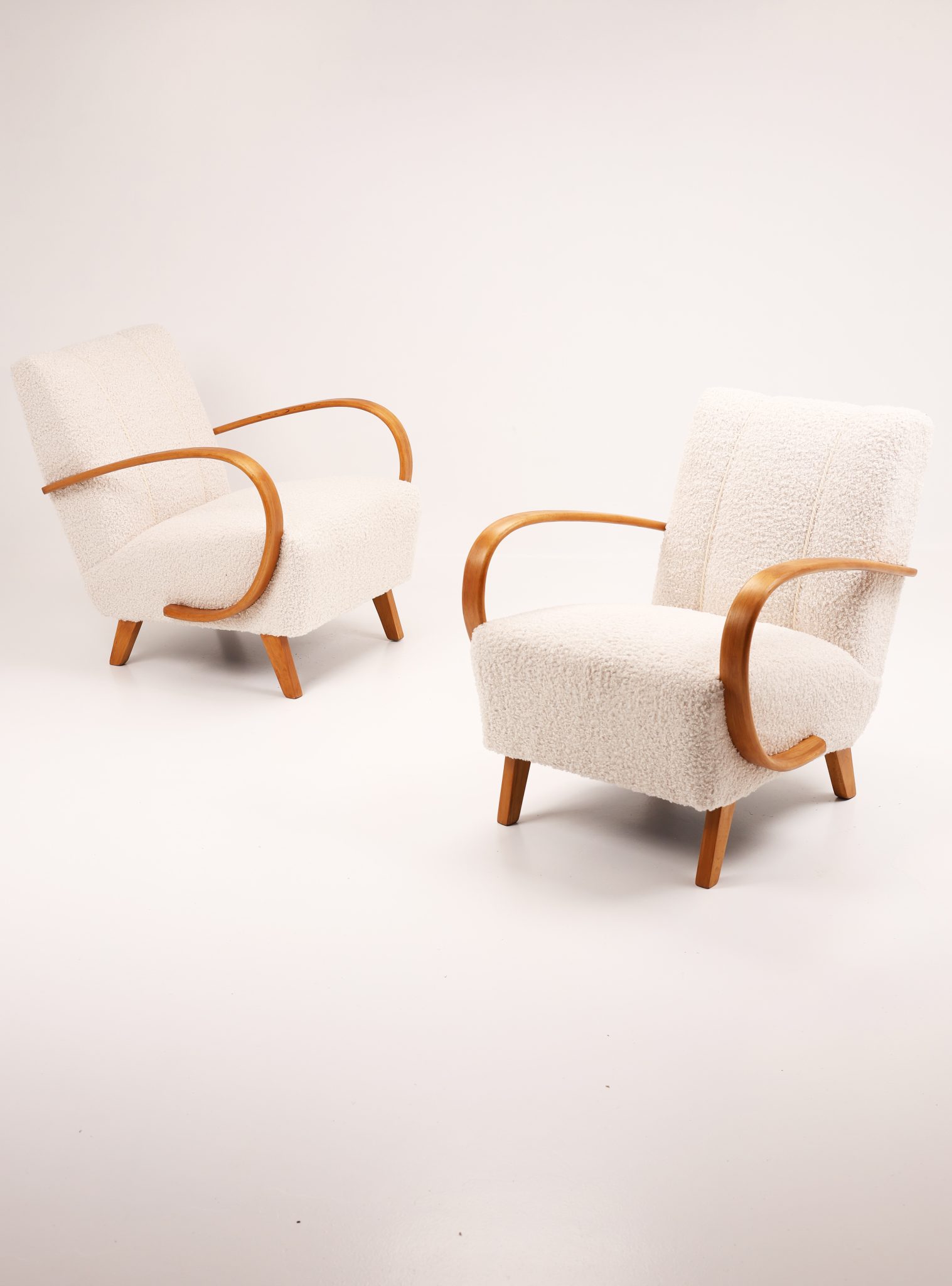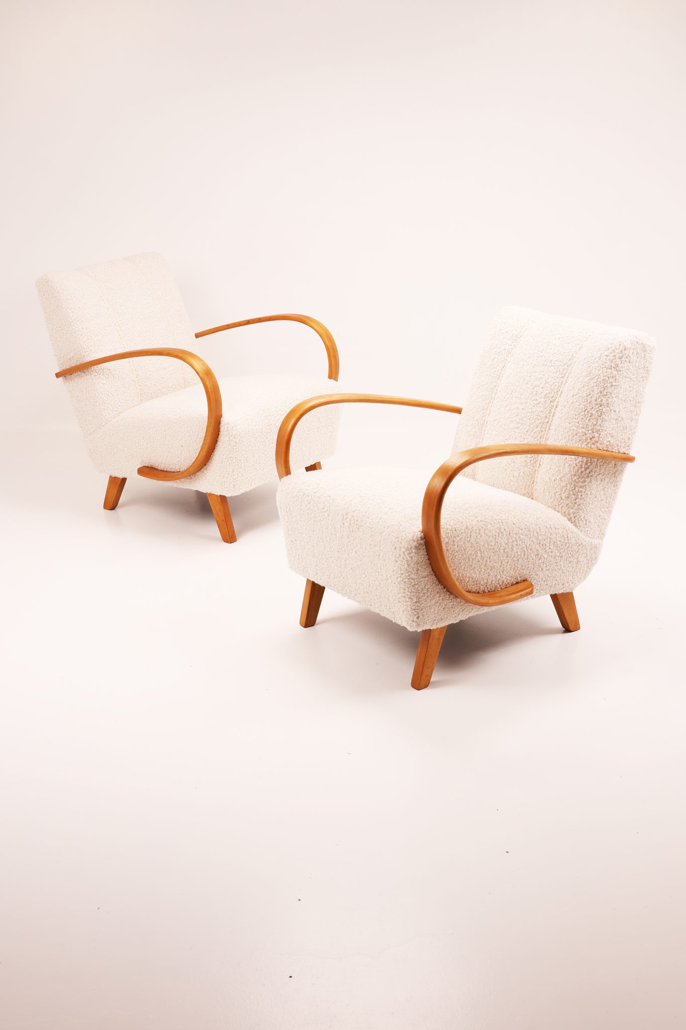 Zachwycająca para kultowych foteli Model H-410 zaprojektowanych przez Jindřicha Halabalę, jedną z czołowych postaci czeskiego modernizmu. Te rzeźbiarskie formy wyróżniają się charakterystycznymi, giętymi podłokietnikami z drewna bukowego oraz eleganckimi proporcjami, które doskonale oddają ponadczasową estetykę modernizmu.