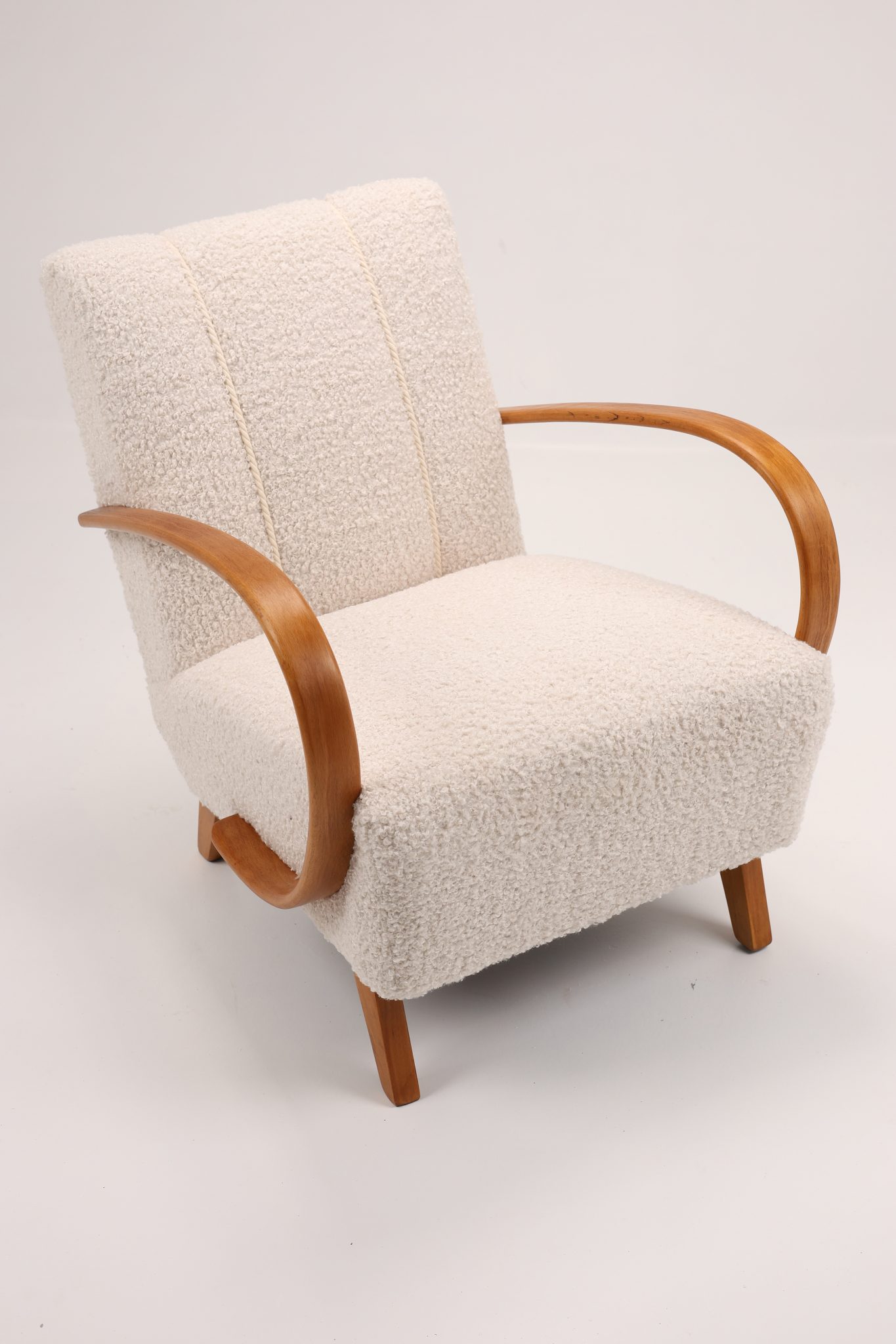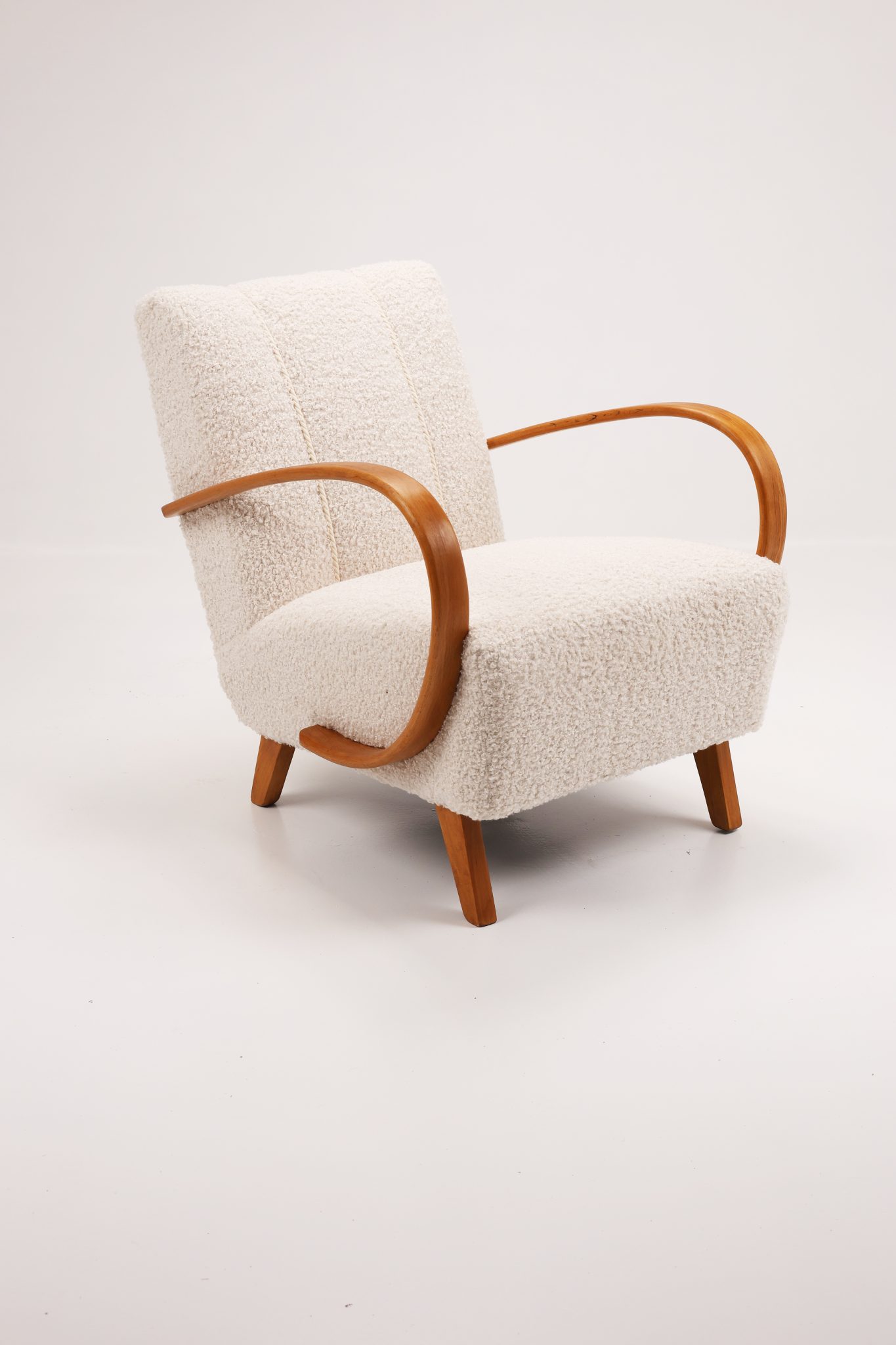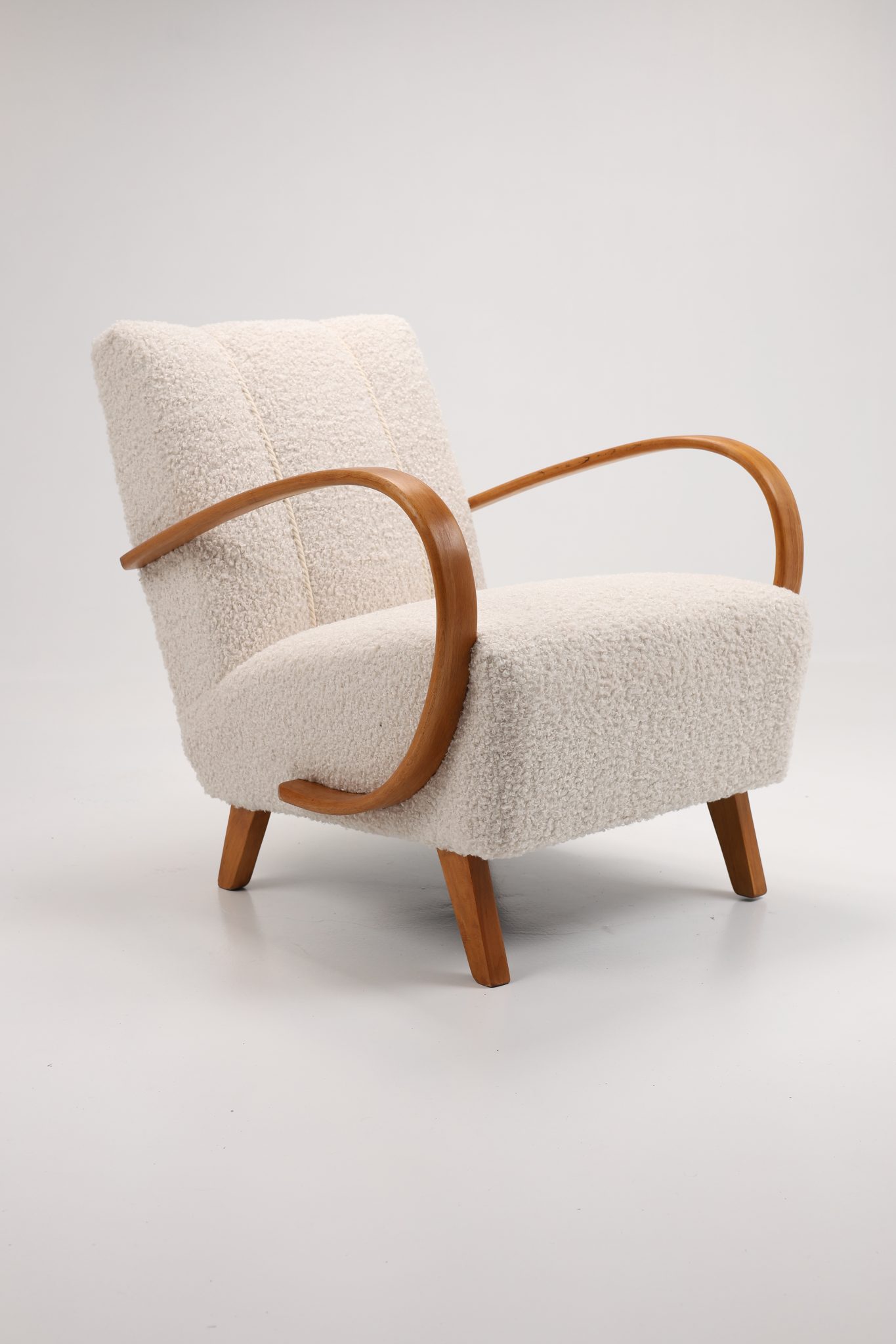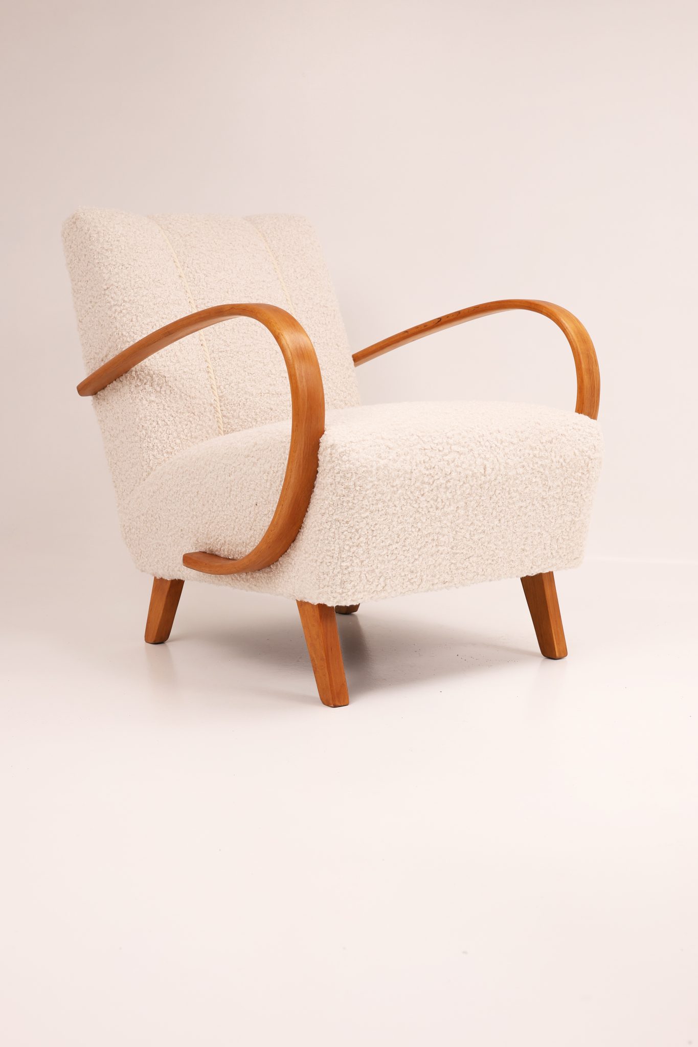 Zachwycająca para kultowych foteli Model H-410 zaprojektowanych przez Jindřicha Halabalę, jedną z czołowych postaci czeskiego modernizmu. Te rzeźbiarskie formy wyróżniają się charakterystycznymi, giętymi podłokietnikami z drewna bukowego oraz eleganckimi proporcjami, które doskonale oddają ponadczasową estetykę modernizmu.