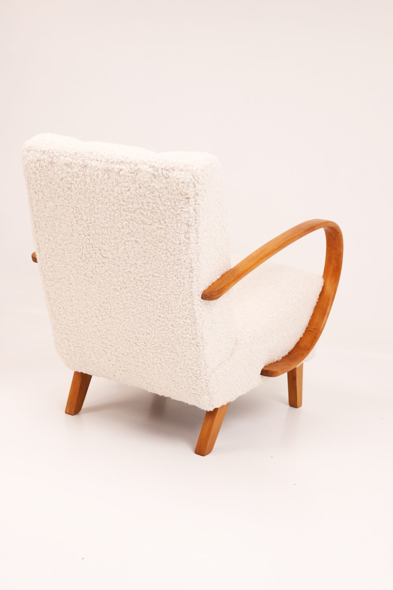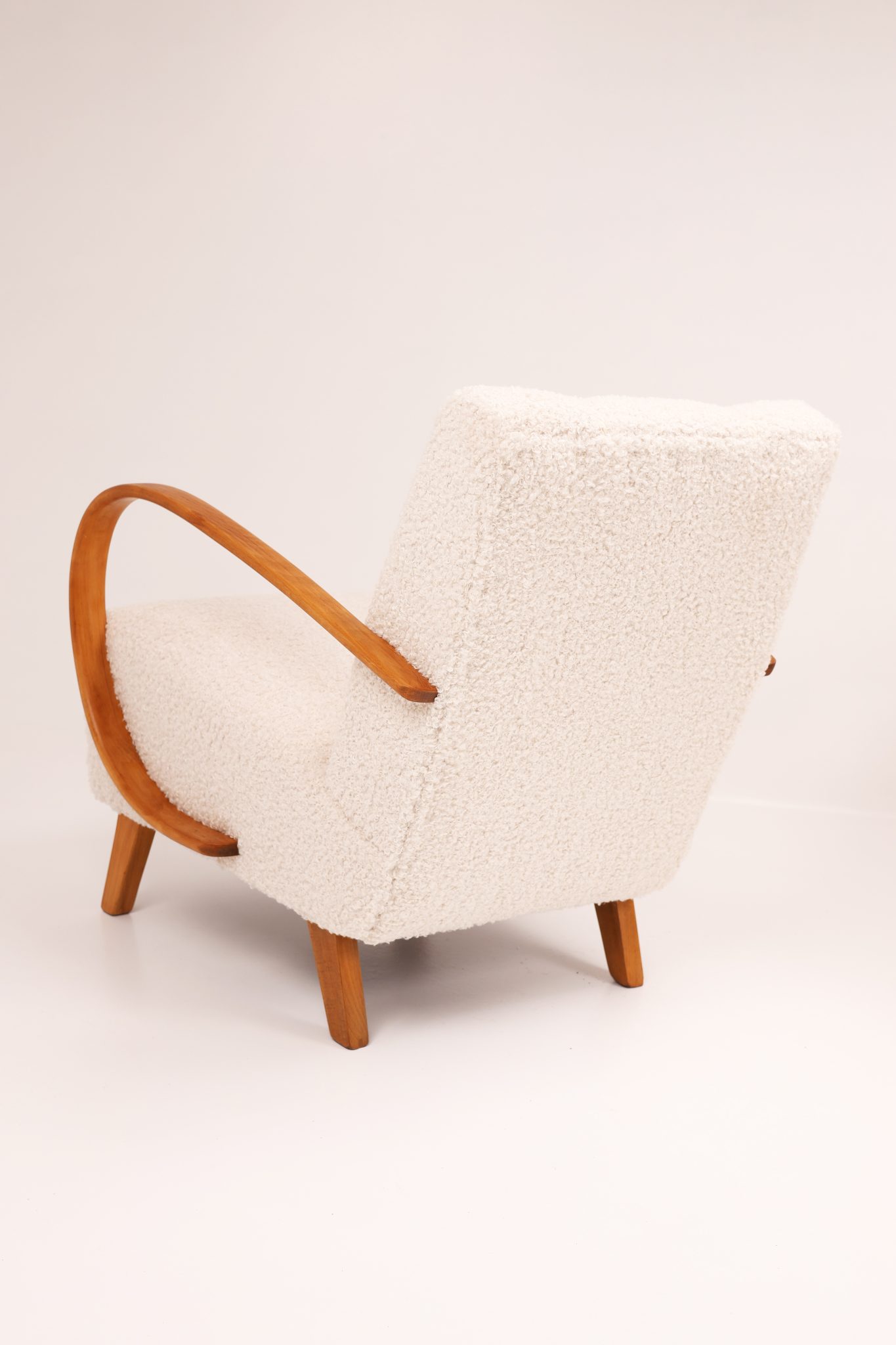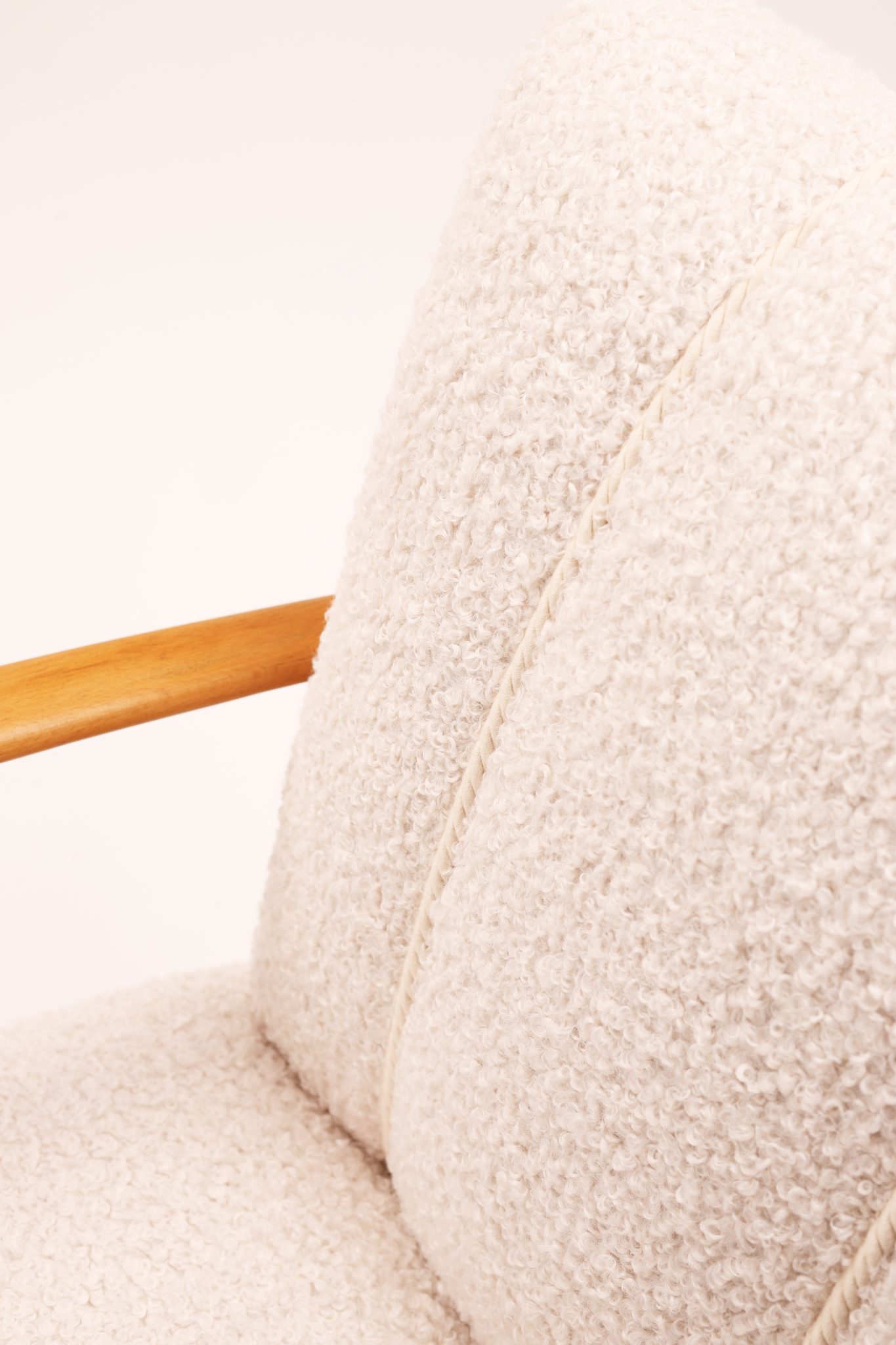 Materiały: drewno bukowe, nowa tapicerka bouclé