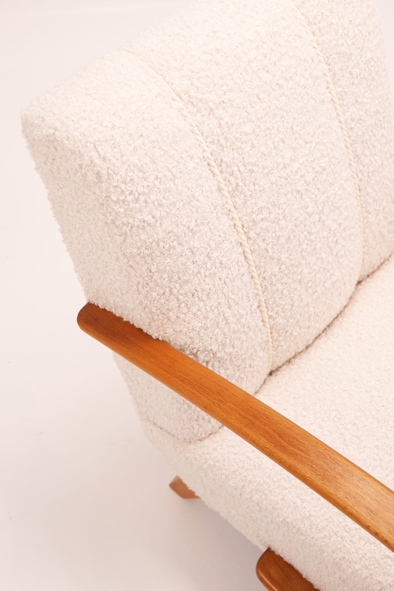 Fotele zostały profesjonalnie odrestaurowane i na nowo tapicerowane luksusową tkaniną typu bouclé w kolorze kości słoniowej, która podkreśla ich miękką, organiczną formę. Elementy drewniane zostały starannie odnowione, aby wydobyć ciepły, naturalny odcień drewna.